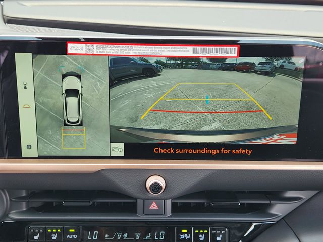 Panoramic view monitor (pvm), lane change assist (lca), traffic jam assist (tja), , front cross-traffic alert (fcta) , outer mirrors with puddle lights and reverse tilt-down feature, and front and rear parking assist with automatic braking (pa w/ab) . Disclaimer: The panoramic view monitor does not provide a comprehensive view of the area surrounding your vehicle. Look around to confirm clearance. See. Owner’s. Manual. For limitations.<br>Lane change assist operates only when dynamic radar cruise control (drcc) and lane tracing assist (lta) are activated. Do not overly rely on this system. Driver must confirm lane is clear. See. Owner's. Manual. For limitations.<br>Traffic jam assist is not an automated driving system, requires driver supervision at all times, and is designed to function on controlled access freeways at speeds of 25 mph or less. Operation requires lane tracing assist to be active. Use this system in accordance with applicable laws. Requires an active subscription to drive connect that depends on 4g network availability and other factors. Service requires account registration through the toyota app and acceptance of connected services terms of use at. Toyota.Com/content/dam/toyota/privacyvts/pdf/connected-services-terms-use.Pdf. And master data consent. Data charges may apply. Before operating, refer to. Owner’s manual. For instructions and limitations.<br>Do not overly rely on the front cross-traffic alert system. Always visually confirm that it is safe to proceed. See. Owner’s manual. For limitations.<br>Front and rear parking assist with automatic braking (pa w/ab) may warn drivers of, and potentially brake for front and rear collisions with certain objects when traveling at low speeds. Drivers should visually confirm clearance during use. See. Owner’s. Manual. For instructions and limitations.