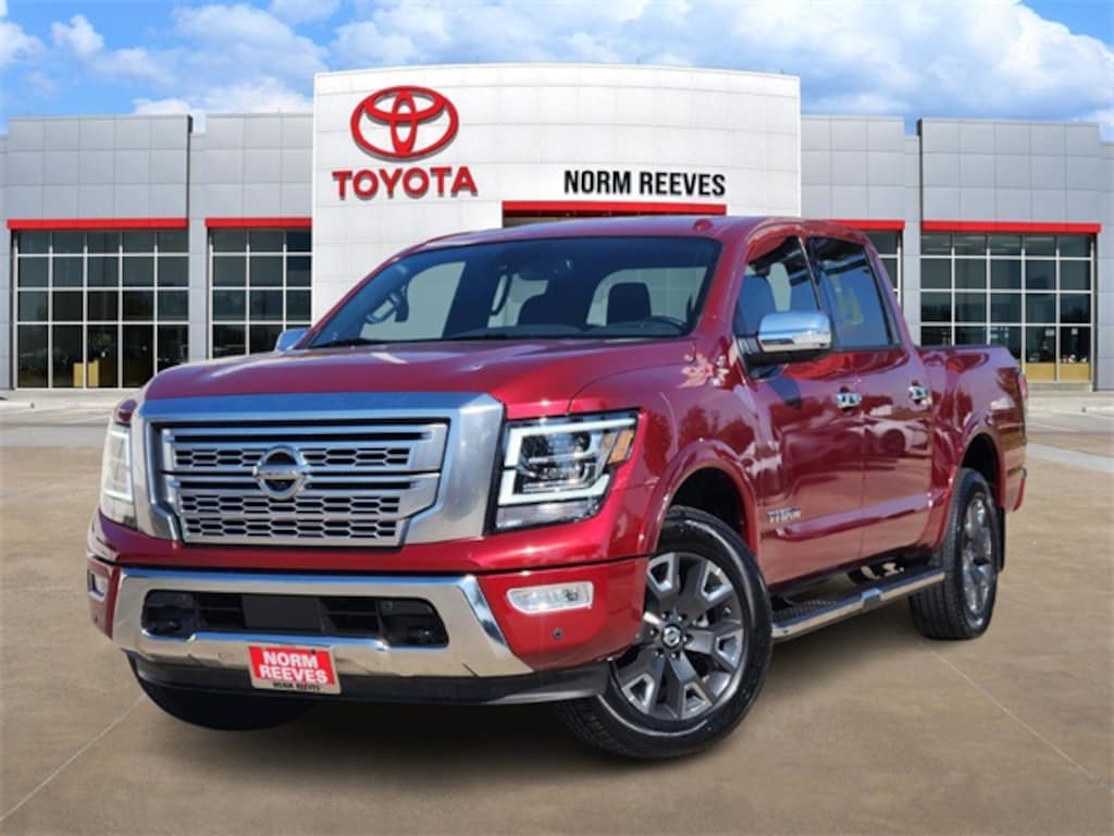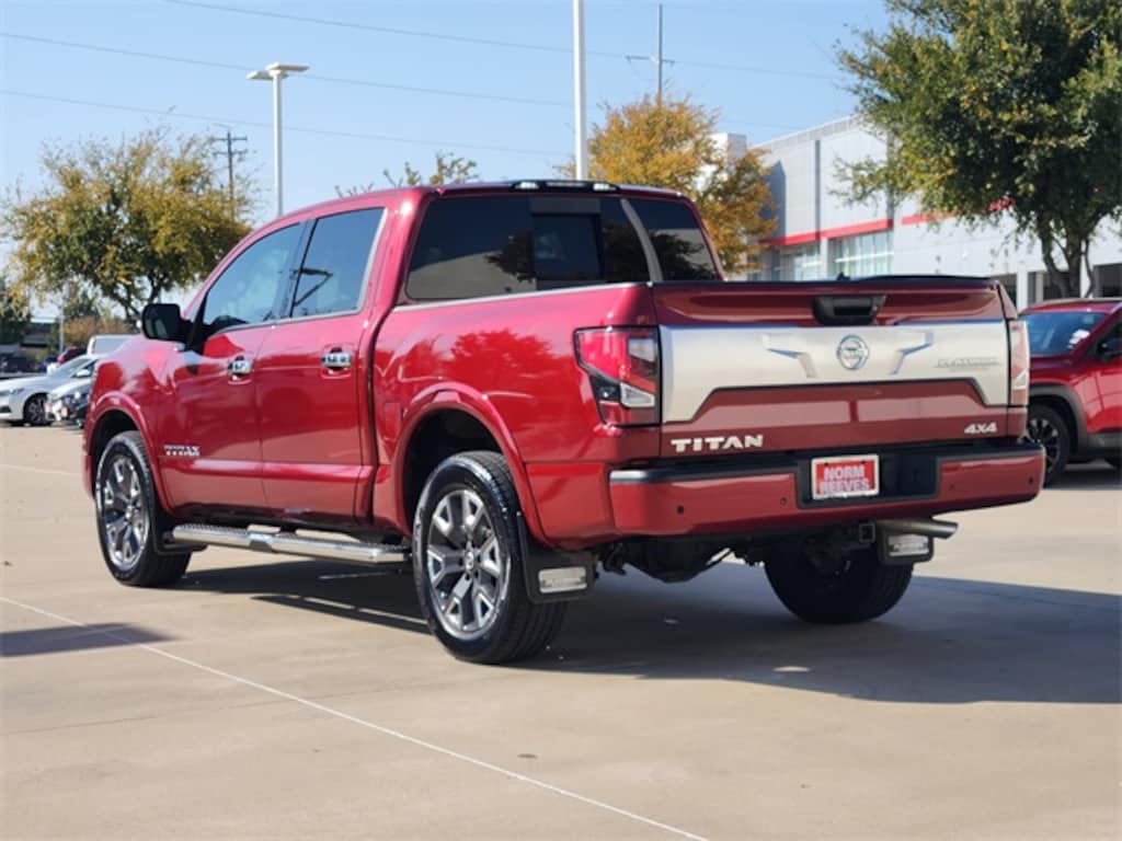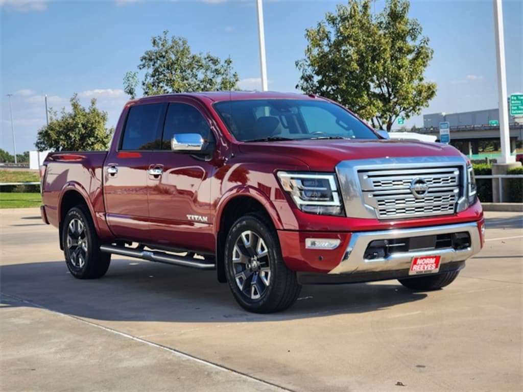 Cardinal Red Metallic 2021 Nissan Titan Platinum Reserve MANAGER'S SPECIAL!, Low Miles!, One Owner, WON'T LAST!, Well Maintained, MUST SEE!, Leather, Sunroof, Premium Audio, Android Auto, Apple Carplay, FULLY SERVICED, 4x4. What are you waiting for? Call or come by today! ***For a no hassle buying experience contact the Norm Reeves Toyota Dallas Pre-Owned Sales Department to honor this Special Internet Price. 945-270-8349 ***Our commitment to customer service is our number one priority. We are dedicated to giving our customers the best internet buying experience possible. Our primary concern is the satisfaction of our customers. Need to trade up? Great, schedule your test drive appointment today & have your car quickly evaluated while you're. Odometer is 45962 miles below market average! 4WD